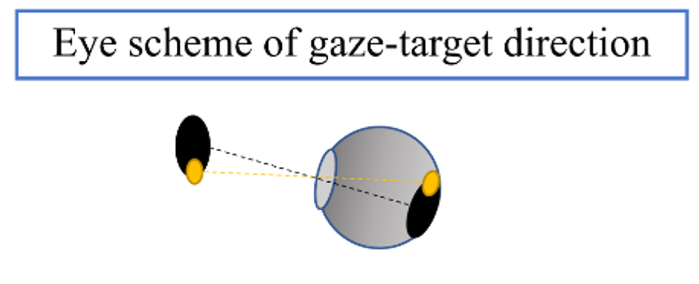 Auf der linken Seite sehen wir eine schematische Darstellung der Augmentierung und auf der rechten Seite die Blickrichtung des Auges, sowie das Skotom in schwarz und das Ziel in gelb, jeweils inkl. der dazugehörigen Position auf der Netzhaut.