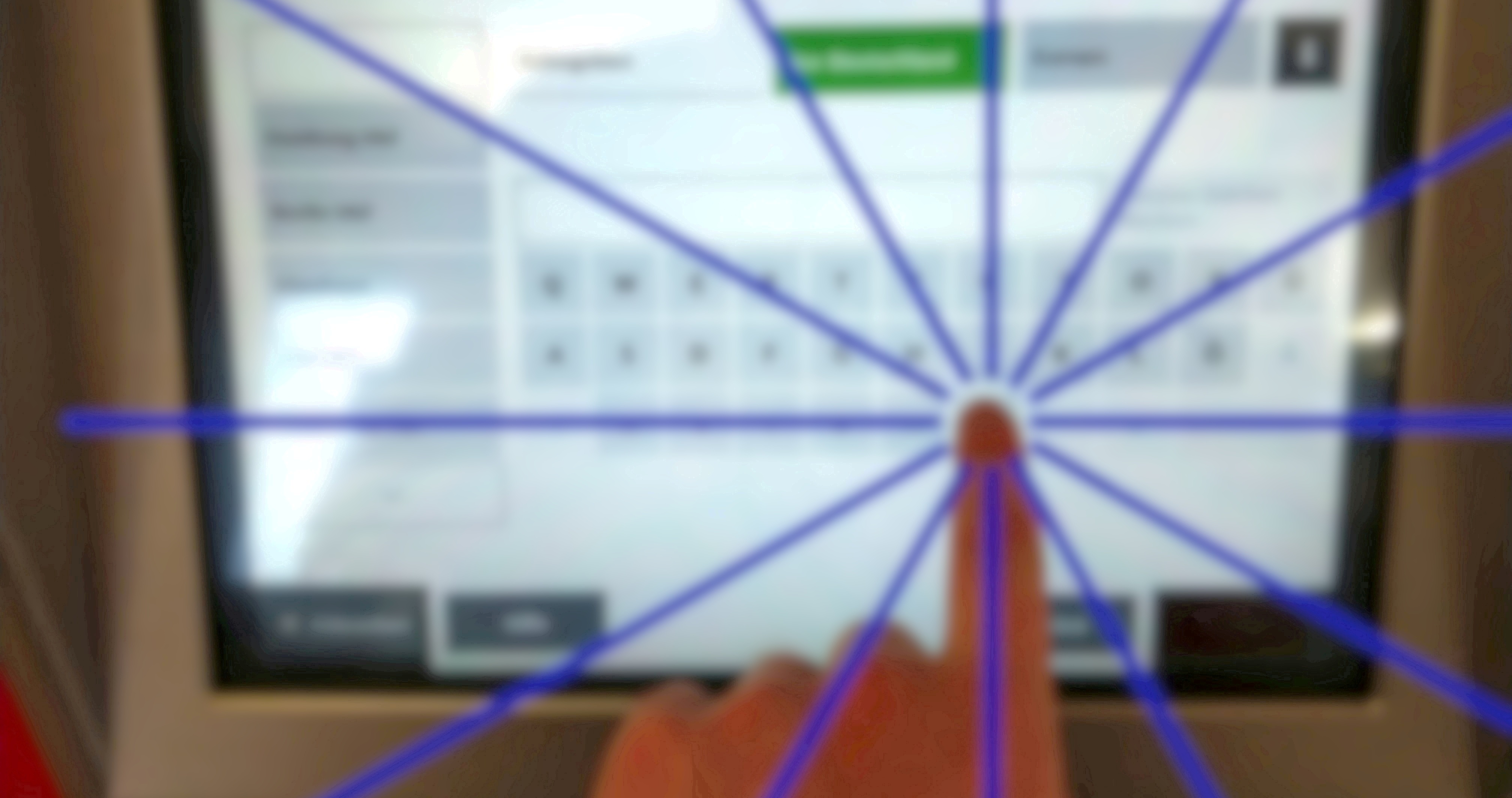 Hier sehen wir das verschwommene Bild eine Fahrkartenautomaten und große blaue Linien, welche sich über der zu drückenden Taste kreuzen.